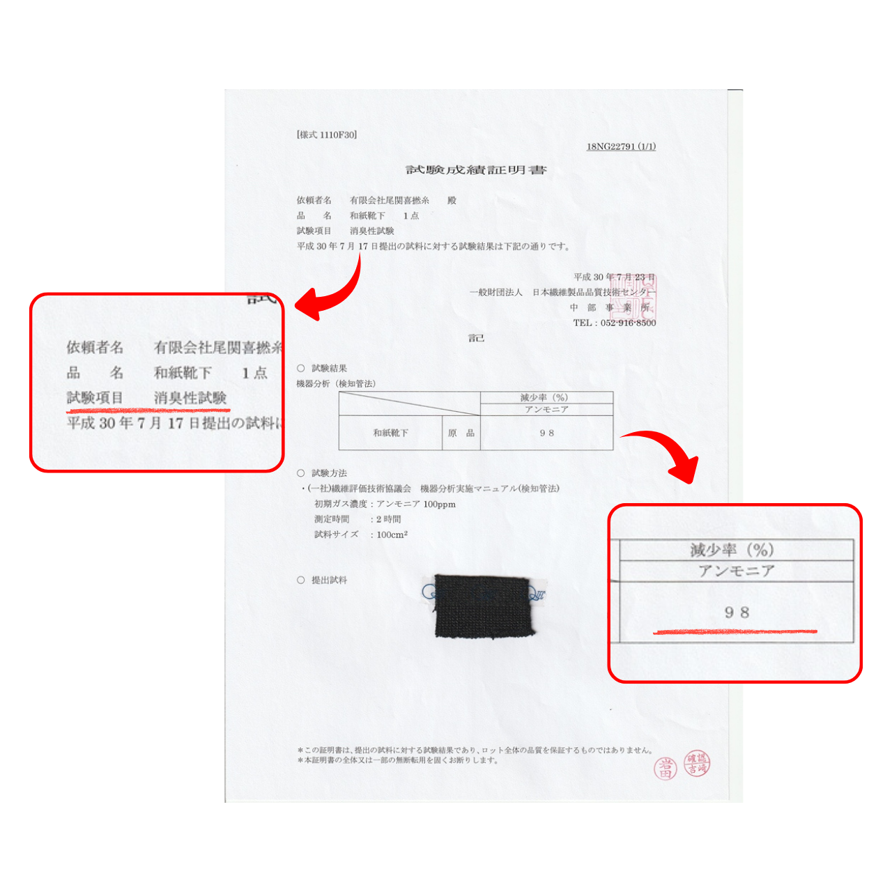 アンモニア臭を付着後、98%のアンモニア臭が減少する結果がでました