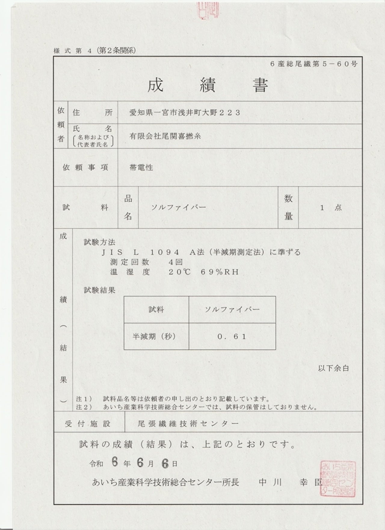 繊維を摩擦で帯電させ、たまった電気を半減させる時間を調べる検査