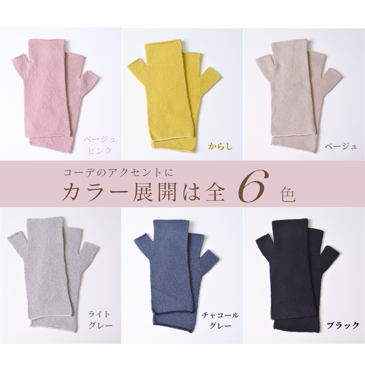 創業70年の撚糸業で培った技術でシルクに伸びる糸を撚糸、独自の糸を使って編み立てたハンドウォーマーはぴったりしていても全く締め付け感のない付け心地を実現しています